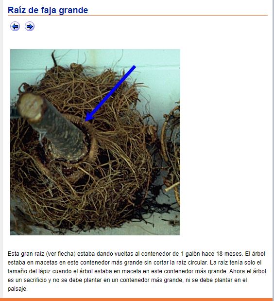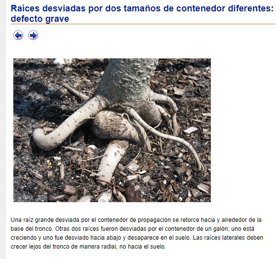 - Raíces mayores de un quinto del diámetro del tronco que crecen en el fondo del contenedor.