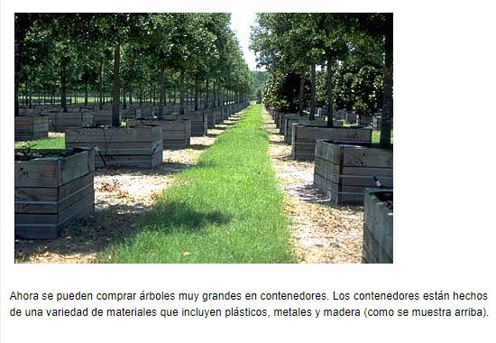 Los árboles crecen aproximadamente al mismo ritmo en los distintos contenedores. Los árboles que crecen en contenedores deben ser podados de raíz para eliminar las raíces circulares y descendentes cada vez que el árbol esté en maceta a un tamaño más grande