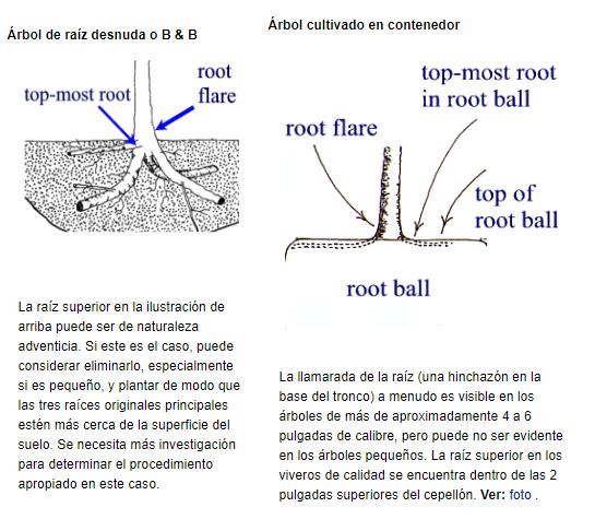 - El lugar donde emerge la raíz superior del tronco es más de 5 centímetros debajo de la superficie.