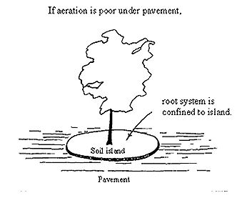 Un buen ejemplo de este tipo de sitio son los árboles de la calle plantados en un recorte de la acera (plantando hoyos en una acera) con edificios altos cerca. A menos que el sitio esté diseñado adecuadamente o que el suelo sea arenoso, las raíces se concentran con frecuencia en el área pequeña del corte porque no pueden extenderse debajo del pavimento debido a la compactación del suelo o las condiciones de acumulación de agua. Debido a que las raíces se concentran en un área pequeña, el suelo en la zona de la raíz se seca rápidamente. También podrían volverse inestables y derivar una caída.