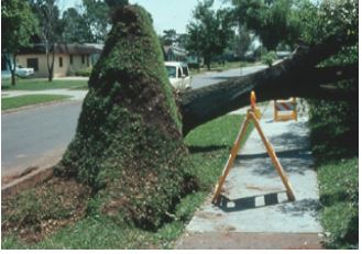 Adapte el tamaño máximo de los árboles al volumen de suelo disponible para el crecimiento de las raíces. Esta estrategia ayuda a mantener los árboles sanos y estables en las tormentas. También evita daños a las aceras, bordillos y pavimento circundantes (Figura 4). El suelo debajo del pavimento generalmente está mal aireado y compactado, una situación que se considera inhóspita para las raíces, a menos que el suelo sea arena gruesa y esté bien drenada. Las raíces se limitarán principalmente al espacio del suelo no cubierto por el pavimento o al espacio entre el suelo y el fondo del pavimento. Esto inhibirá el desarrollo de un sistema de raíces fuerte y puede provocar que el árbol se vuelva inestable en los vendavales.