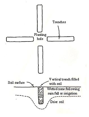 El agua que se escapa de un sitio puede transportar tierra, pesticidas y fertilizantes que contribuyen a la degradación ambiental. El suelo a menudo se clasifica (forma) para mantener la mayor cantidad de agua posible en el sitio. Para reducir la escorrentía y la sedimentación, el agua redirigida debe permanecer en el sitio, en lugar de ser canalizada hacia calles o arroyos. Las carreteras y otros espacios lineales rodeados de bordillos pueden diseñarse para retener agua si el drenaje es adecuado. Use una zanjadora para cavar cuatro o más zanjas del hoyo de plantación, luego rellene sin apretar con el suelo de la zanja (Figura 10). Esto proporciona canales para el crecimiento de las raíces en un sitio compactado, mejora un poco el drenaje, aumenta la filtración de agua y reduce la escorrentía.