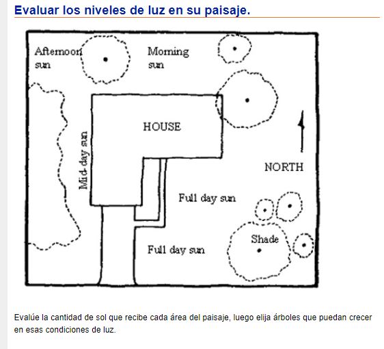 Los árboles que requieren pleno sol necesitan al menos seis horas de sol directo, pero el sol durante todo el día a menudo produce la mejor forma y crecimiento. Los árboles adecuados para pleno sol a sol parcial / sombra parcial se adaptarán a un sitio que reciba de tres a seis horas de sol directo. Los árboles amantes de la sombra están adaptados a sitios con sol filtrado o sombra filtrada, o aquellos que reciben menos de tres horas de sol directo. La mayoría de los árboles grandes crecen mejor a pleno sol. Algunos árboles pequeños crecen mejor en sitios que reciben sombra durante parte del día.