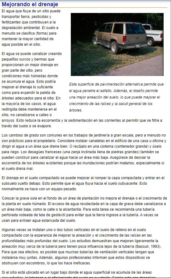 tolerantes a los sitios húmedos pueden sobrevivir en los suelos difíciles (por ejemplo, taxodium,, sweetbay, pond pond, etc.). El uso de árboles con sistemas de raíces agresivos (por ejemplo, ficus y roble) debe considerarse con cuidado porque a menudo se forman grandes raíces superficiales. Estos pueden interrumpir las operaciones de corte de césped y pueden dañar los bordillos, las aceras, el pavimento y otras estructuras cercanas.