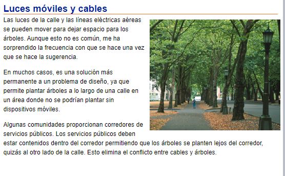 Las luces de la calle y las líneas eléctricas aéreas se pueden mover o modificar para dejar espacio a los árboles. Aunque esto no es común, es sorprendente la frecuencia con que se hace una vez que se hace la sugerencia. En muchos casos, es una solución más permanente a un problema de diseño, ya que permite plantar árboles a lo largo de una calle en un área donde no se deben plantar sin mover o modificar accesorios. (Figura 9). Algunas comunidades diseñan corredores de servicios públicos que contienen servicios públicos dentro de un área específica y permiten plantar árboles fuera del corredor sin interferencia.