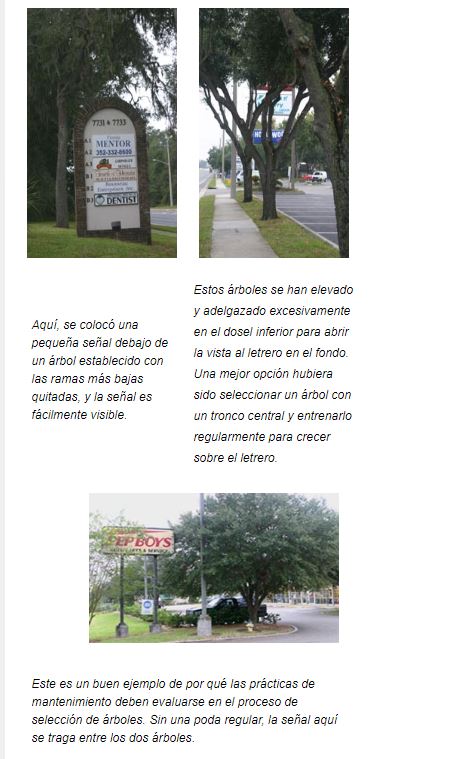 Los árboles pueden bloquear las fachadas de los edificios, las características arquitectónicas interesantes y los letreros en las áreas del centro. Hay varias soluciones a este problema potencial. Se pueden comprar arboles de gran tamaño que tiene la mayoría de las ramas más altas que los letreros bajos en cualquier vivero..