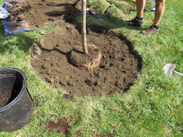 Excave el hoyo un poco menos profundo que esta profundidad y tan ancho como sea posible (al menos 1.5 veces el ancho del cepellón, cave un hoyo mucho más ancho y menos profundo en tierra compactada ). No cavemos el hoyo más profundo que el cepellón. Considere perforar agujeros debajo del cepellón en tierra compactada o roca para alentar algunas raíces profundas.
