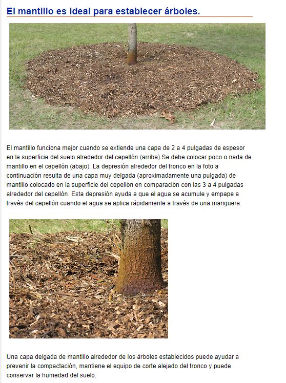 :Aplique una capa de mantillo de 10 a 12 centímetros de espesor (después de asentarse) en un círculo de al menos 30 centímetros de diámetro alrededor de la planta, o mantenga el área libre de malezas con herbicidas, para ayudar a desalentar las malas hierbas y el césped. Esta área debe mantenerse durante el período de establecimiento de al menos 10 centímetros de diámetro (preferiblemente 20 ) por cada 2´5 centímetros de diámetro del tronco del árbol (para alentar el establecimiento rápido, el diámetro mínimo debe ser de 30 centímetros para los árboles con un diámetro de tronco de menos de 7 centímetros) . Aplique una capa más delgada de mantillo sobre el cepellón, por razones estéticas si lo desea, pero manténgalo al menos a 30 centímetros del tronco (área libre de mantillo de 60 centímetros de diámetro) para que la corteza del tronco pueda secarse.