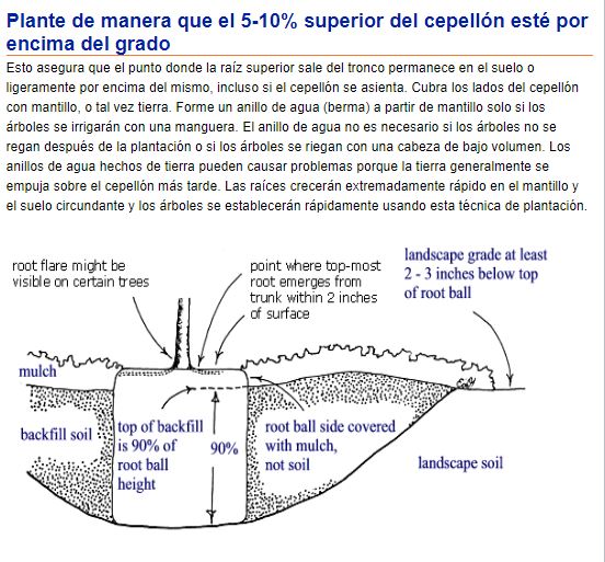 Superficial mejor que profundo! Muchas personas plantan árboles muy profundamente. A menudo se recomienda un hoyo de dos o tres veces el ancho del cepellón, pero es más común aproximadamente un diámetro y medio. Se deben usar agujeros más anchos para suelos compactados y sitios húmedos. Esto podría ayudar a que las raíces no se deformen por el borde del hoyo en suelos compactos o arcillosos. En la mayoría de los casos, la profundidad del hoyo debe ser menor que la altura del cepellón, especialmente en tierra compactada o húmeda.