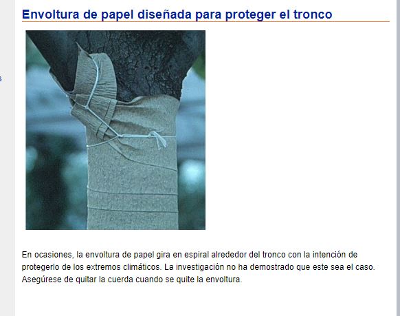 El material más comúnmente utilizado, la envoltura de papel, no amortigua las temperaturas como se presume ( Litzow y Pellet 1983 ). Hay poca investigación que haya validado la práctica de envolver o rociar el tronco para evitar la quema de sol. La envoltura del tronco probablemente hace poco daño al árbol, siempre que permanezca intacta en invierno y se retire la primavera siguiente junto con cualquier cinta y cuerda utilizada para atarlo al tronco.