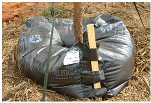 Si los árboles se regarán con poca frecuencia (solo varias veces) después de la plantación, solo se deben plantar de semillas, plántulas o pequeños retoños de árboles tolerantes a la sequía. El árbol de pequeño tamaño de vivero tiene una copa pequeña, por lo que las raíces se equilibran con el árbol poco después de la plantación. Cuando las raíces se equilibran con la copa del árbol, generalmente sobreviven y crecen bien solo con lluvia en climas húmedos, o solo con el sistema de riego en climas secos del desierto.
