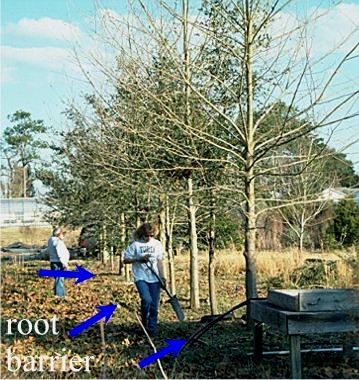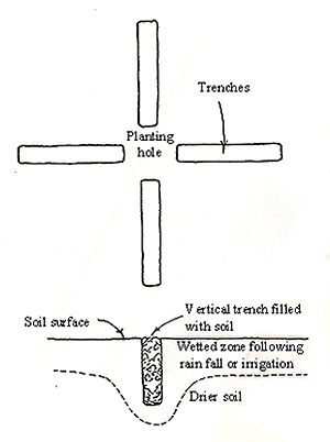 Se pueden cavar varias zanjas de dos a tres pies de profundidad desde el hoyo de plantación como radios en una rueda. Una retroexcavadora o una zanjadora pueden cavar zanjas rápidamente. Algunas personas se refieren a esta técnica como mulching vertical. El suelo modificado u original se puede volver a colocar en la zanja, aunque no hay evidencia de que el suelo modificado aumente más el crecimiento de las raíces que el relleno con el suelo original.