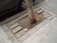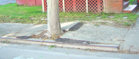 Las raíces en la base de ciertos árboles se vuelven extremadamente grandes y pueden desplazar el bordillo, las aceras y el pavimento. El bordillo y el pavimento se levantaron hasta dos pies al lado de cada uno de los árboles en esta calle..