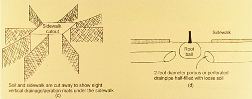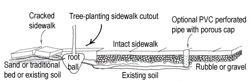 Los sitios con suelos profundos y bien drenados a veces pueden soportar árboles sanos con una elevación mínima de la acera alrededor de los recortes. Esta situación no es común en suelos altamente perturbados como los distritos y centros comerciales del centro. La desventaja de alentar a los árboles sanos en los recortes mal diseñados es que las raíces cerca del tronco de los árboles sanos a menudo elevan la acera circundante. Las técnicas diseñadas para alentar el crecimiento de las raíces debajo del pavimento alrededor de la acera individual o los recortes del pavimento sin afectar la integridad del pavimento se practican actualmente.