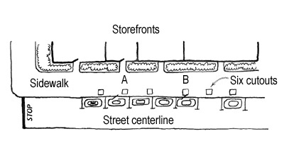 Los recortes deben colocarse a lo largo de las calles y aceras para minimizar el daño de los autobuses, camiones, automóviles y peatones (ver la posición «A» a continuación). Los recortes colocados incorrectamente (posición «B») pueden colocar al árbol en el camino de los peatones. Abrir puertas de automóviles puede golpear los troncos de árboles colocados incorrectamente.