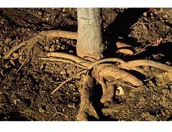 Típicamente, 6 a 10 raíces crecen desde la base del tronco. Estos se agrandan para convertirse en las raíces principales del árbol. Dependiendo de la especie o cultivar en particular, estos pueden surgir del suelo porque las raíces a menudo aumentan de diámetro en la parte superior más que en la parte inferior. Nunca corte ni dañe estas raíces porque son en gran parte responsables de la estabilidad del árbol, es decir, sostienen el árbol en posición vertical.