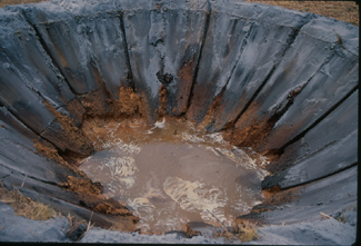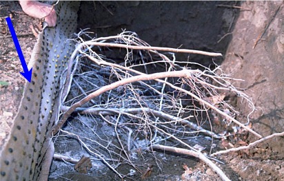Se usó una gran espada de árbol para cavar este agujero, revelando una capa freática poco profunda.