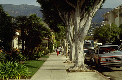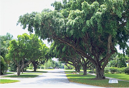Ficus con abundante espacio en el suelo para la expansión de las raíces. La franja de plantación tiene veinte pies de ancho y las raíces pueden crecer en el césped de las casas a lo largo de la calle. Se plantaron árboles a unos 60-70 pies de distancia. Debido a que los árboles estaban espaciados tan lejos, comenzaron a crecer extremidades inferiores agresivas.