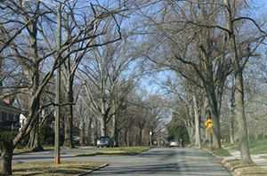 Las raíces pueden crecer debajo de las aceras y hacia el césped de las casas a lo largo de esta calle. Esto les ha permitido ganar un tamaño tremendo. Los árboles se plantaron a una distancia de 40 a 50 pies en una franja de plantación de 10 pies de ancho. Este espacio permitió que las copas de los árboles individuales se tocaran, fomentando el desarrollo de una forma vertical más natural.