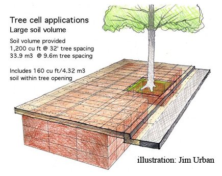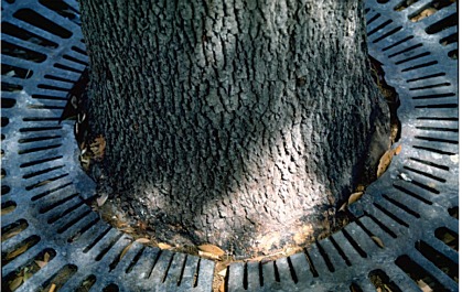 Los árboles crecen mal en áreas urbanas a menos que el suelo debajo y adyacente a superficies duras apoye el crecimiento de las raíces.