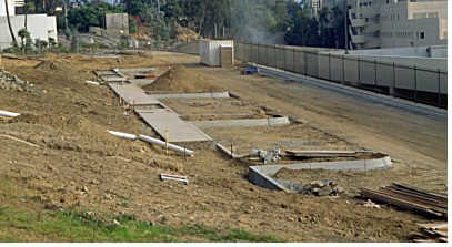 Las zanjas excavadas en el perfil del suelo también pueden mejorar el drenaje . El agua se acumula en el suelo aflojado en la zanja y se infiltra en el perfil del suelo en lugar de salir corriendo. Crear terrazas con muros de contención ayuda a nivelar un sitio que permite que el agua se filtre a través del suelo en lugar de escurrirse.