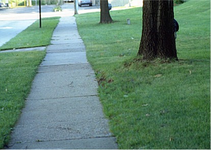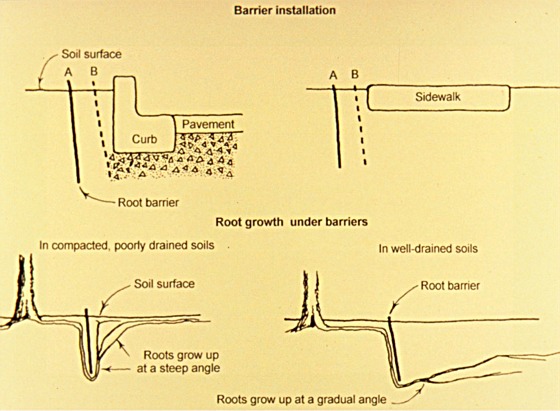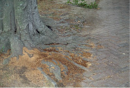 1) Algunos árboles desarrollan un brote de raíz muy prominente o hinchazón en la base del tronco. Este contrafuerte puede levantar las aceras y bordillos poco después de plantar en muchas circunstancias si no se incorporan disposiciones especiales en el diseño. Los árboles que causan daños tienden a ser aquellos que crecen hasta un gran tamaño. Si bien la plantación de árboles pequeños en estatura puede ayudar a minimizar el daño a las aceras y aceras, los árboles pequeños brindan pocos beneficios a la comunidad que brindan los árboles grandes.