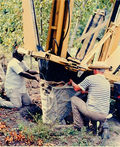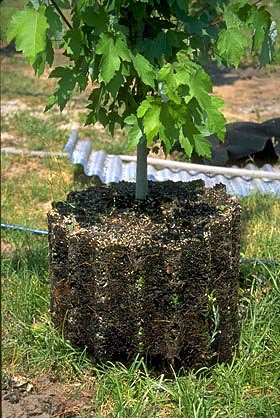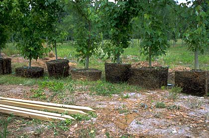 Una innovación reciente debería eliminar la necesidad de arpillera sintética en una canasta de alambre. Permite que el árbol se mantenga en el vivero durante muchos meses después de excavar sin producir raíces de gran diámetro fuera del cepellón. Así es como funciona el sistema. Los árboles se excavan y se colocan en arpillera natural y luego se aseguran con alambre o cuerda para mantener apretado el cepellón. El cepellón intacto se baja en un hoyo previamente excavado en el vivero que está forrado con una manga hecha de tela negra de vivero