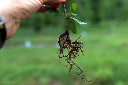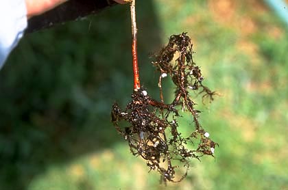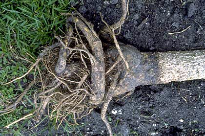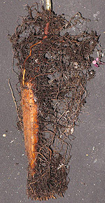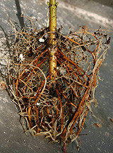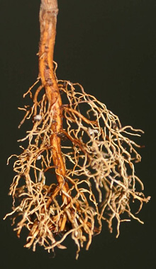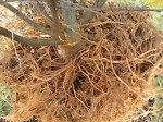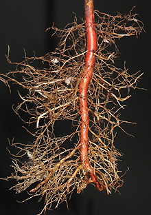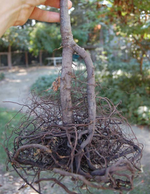 Poda de raíces durante la producción de campo. raíces podadasLos robles podados y otros árboles desarrollan un sistema radicular más denso cuando se poda regularmente durante la producción en el campo. La poda de raíces estimula el desarrollo de nuevas raíces cerca del extremo de la raíz cortada (ver foto a la derecha). Los árboles podados de raíz se trasplantan mejor que los árboles no podados de raíz antes del trasplante.