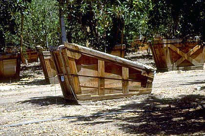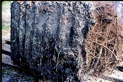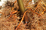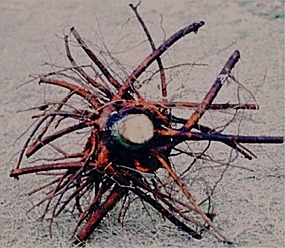 Dos ejemplos (caoba a la izquierda,taxodio a la derecha) debajo de los sistemas de raíces de revestimiento con amplias raíces laterales producidas al crecer en un recipiente con lados y fondo compuestos de 90% de aire y 10% de plástico. Este sistema de raíz de revestimiento puede producir un vivero terminado bien adaptado a los suelos urbanos debido al crecimiento de la raíz ampliamente lateral. Las pruebas están en marcha (abril de 2010).