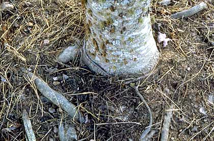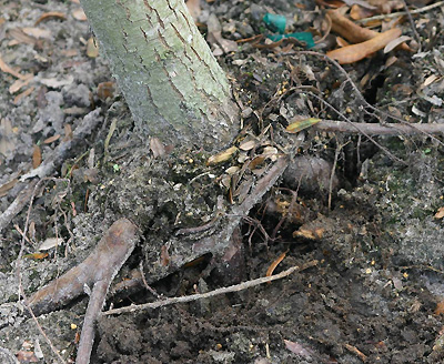 Las raíces desviadas por las paredes del contenedor crecen hacia arriba, hacia abajo o alrededor de la pared del contenedor (foto a continuación). Se retuercen cuando están estresados por la acción del viento que los debilita. Las raíces desviadas por las paredes del contenedor también raíces retorcidas crecen alrededor del tronco, lo que puede provocar que algunas partes del tronco se estrangulen (centro de la foto a la derecha). Esto restringe el movimiento del agua y los elementos hacia arriba del tronco y puede provocar que parte del árbol muera hacia atrás. A veces todo el árbol muere; a veces el árbol crece a través de esto y parece estar bien. Tronco estrangulado