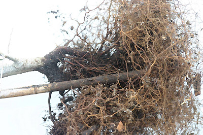 4) Contenedores de poda de aire, papel: este nuevo producto está hecho de papel muy delgado sostenido por una malla de plástico abierta. Las raíces crecen hasta el borde del contenedor (el papel) y muchas crecen a través del papel y mueren. Esto poda (mata) las raíces alentando a nuevas raíces a crecer detrás de la porción podada de la raíz.