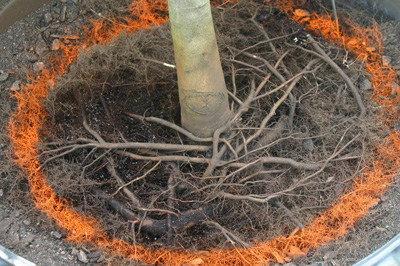 Retirar la porción exterior del cepellón (ver foto a la derecha) mejora la calidad del sistema radicular al podar las raíces circulares, descendentes, ascendentes y retorcidas. Este tipo de poda de raíz no ha matado ningún árbol en nuestros proyectos de investigación siempre que proporcionemos un riego abundante inmediatamente (dentro de una hora más o menos) después de la poda. Algunos de los viveros que comienzan a probar este procedimiento han matado algunos árboles. Esto se ha atribuido a la falta o riego después de la poda y los sistemas radiculares pobres.