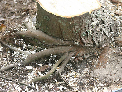 La poda de la raíz de la pala se logró cortando una pala de bolas de punta cuadrada de 36 cm (14 pulgadas) de largo en el suelo en un ángulo similar al de una pala de árbol mecánica. En abril de 1999 se podaron ocho segmentos de circunferencia norte y sur (12.5 por ciento de la circunferencia, totalizando un 25% de circunferencia), a 20 cm (8 pulgadas) del tronco y uno y ocho segmentos este y oeste en mayo. La poda de raíces se repitió en agosto (segmentos NW y SE) y septiembre (segmentos NE y SW) a 27 cm (11 pulgadas) del tronco. La parte inferior de la pala de mano no llegaba lo suficiente al suelo para superponerse a las rebanadas adyacentes, por lo que no se cortaron las raíces que crecían directamente debajo del tronco.