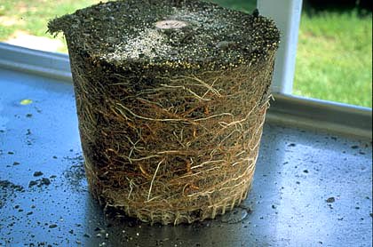 Los pequeños recipientes de propagación que podan al aire o están recubiertos con hidróxido de cobre promueven la ramificación de las raíces en lugar de la desviación. Esto parece reducir la probabilidad de que las raíces crezcan, bajen o rodeen la pared del contenedor (ver foto superior derecha).cortando raíces