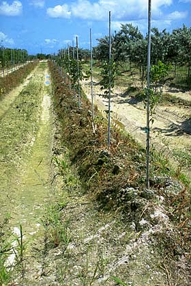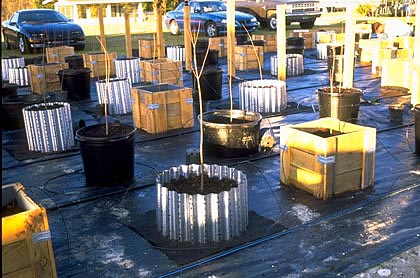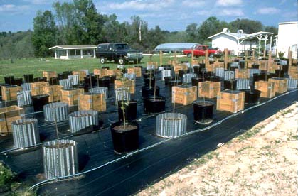 Se plantaron árboles de roble vivo ( Quercus virginiana ) (contenedor n. ° 1) en diciembre de 1997. Los árboles se fertilizaron usando 8-10-10 en abril de 1998. Posteriormente recibieron 20-6-12 de cinco a seis veces por año. , Marzo o abril a septiembre de cada año. Las cantidades de fertilizante comenzaron en 130 g 8-10-10 por árbol, luego 32.5 g 20-6-12, aumentando a medida que los árboles crecieron a 130 g 20-6-12 en el primer año, 260 g (primera fertilización) a 390 g ( última fertilización) en el segundo año y 390 g en el tercer año. Los árboles tenían un calibre de 2,4 pulgadas y una altura de 12 pies en julio de 2000, lo que representa el crecimiento normal del vivero para el roble vivo cultivado en campo.