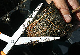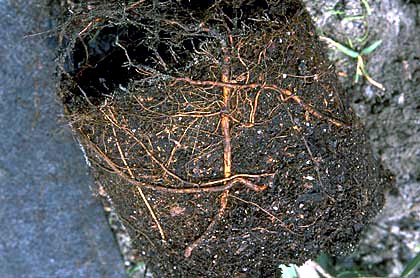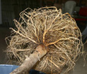 Los pequeños recipientes de propagación que podan al aire o están recubiertos con hidróxido de cobre promueven la ramificación de las raíces en lugar de la desviación. Esto parece reducir la probabilidad de que las raíces crezcan, bajen o rodeen la pared del contenedor (ver foto superior derecha).cortando raíceslos árboles jóvenes pueden tener sus raíces extendidasLa poda mecánica de la raíz también se puede usar en la mayoría de las especies de árboles y arbustos para eliminar la mayoría de los defectos de la raíz. La poda que parece eliminar la mayoría de los defectos se despega o afeita toda la superficie exterior del cepellón, incluida la parte inferior (foto derecha). Si las raíces son suaves y jóvenes, se pueden arrancar o arrancar del borde del cepellón y extenderlas al sustrato del contenedor más grande o al suelo (foto de la izquierda). Esto lleva mucho tiempo y los resultados pueden ser variables. Ver: para árboles más grandes.