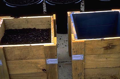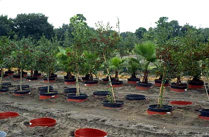 6) Contenedores recubiertos de cobre: algunos interiores de los recipientes están recubiertos con un compuesto de cobre (Spin OutTM, Griffin Corp., Valdosta, GA). Se producen menos raíces circulares en los árboles en estos contenedores si los árboles no se dejan demasiado tiempo (Struve et al. 1994). Las primeras pruebas indican que después de la plantación en el paisaje, el alargamiento de la raíz y el crecimiento de los brotes y el tronco es similar o ligeramente mayor que el crecimiento en los árboles de contenedores convencionales de lados lisos (Struve 1994; Marshall y Gilman 1998 ; Gilman 2001 ).