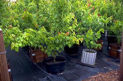 Los siguientes ejemplos son de árboles tropicales y templados que crecen en contenedores de 15 galones (# 15). Se raparon bolas de raíz de tres galones (# 3) (columna izquierda) o no (columna derecha) a medida que se plantaron árboles en contenedores de 15 galones.