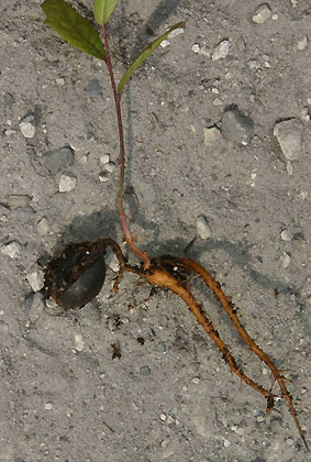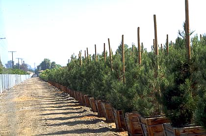 Muchos árboles de vivero producidos en el suelo del campo se propagan con semillas plantadas directamente en el suelo del vivero, o con árboles plantados de contenedores. Un año o más después, los árboles se pueden mover a un campo diferente dependiendo del vivero. Las semillas plantadas directamente en el suelo del campo suelen desarrollar una raíz de grifo (foto derecha). Puede haber o no raíces de ramas laterales que crecen desde la raíz del grifo. Muchos árboles desarrollan solo unas pocas ramas laterales; Algunos árboles no desarrollan raíces laterales en esta etapa de su vida.