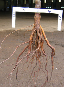 No se ha identificado el sistema de raíces ideal para plantar en paisajes urbanos, pero los investigadores están trabajando para lograrlo. Antes de determinar cómo hacer crecer el sistema raíz ideal, debemos determinar cómo sería un buen sistema raíz. Aquí hay algunos pensamientos al respecto en una serie de fotografías a continuación. Tenga en cuenta que algunas raíces grandes están orientadas tanto lateralmente como hacia abajo en los mejores sistemas de raíces; mientras que la mayoría están orientados hacia abajo o alrededor de los sistemas de raíces pobres. Los sistemas de raíces de mayor calidad también tienen varias raíces principales grandes que emergen justo debajo de la superficie del suelo. Las primeras pruebas muestran que los árboles de la izquierda con mejores sistemas de raíces estaban mejor anclados al suelo después de la plantación que aquellos con una calidad inferior (aquellos del lado derecho)