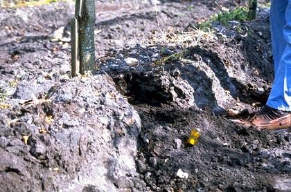 Dos años después, los sistemas raíz pueden parecerse al sistema raíz que se muestra a la derecha (foto cortesía de Keith Warren). Esta forma de raíz puede estar mal adaptada a ciertos tipos de suelo compactado, y puede que tenga que desarrollar un sistema de raíces mucho menos profundo después de plantar para prosperar en el paisaje. Necesitamos más investigación sobre esto. Algunos árboles forman un sistema de raíces con raíces poco profundas y raíces profundas como el árbol que se muestra a continuación (foto cortesía de Keith Warren). Los árboles con esta forma de raíz pueden adaptarse más rápido a los suelos típicos de muchos paisajes urbanos, ya que algunas raíces principales están cerca de la superficie donde el oxígeno es más frecuente. El nivel del suelo en ambos árboles está indicado por la pieza horizontal de plástico blanco con el número «4».