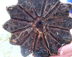 La maceta de papel produjo buenas raícesEste Ellepot hecho de papel muy delgado (que se muestra a la derecha) hizo crecer los dos sistemas de raíz que se muestran a continuación. Está construido de papel muy delgado. Tenga en cuenta que el papel se encuentra en una olla de plástico con muy poco plástico. La parte inferior del soporte de plástico debe tener muy poco plástico en contacto con la superficie inferior del sustrato. Esto es importante ya que el plástico desvía las raíces. Las macetas Elle colocadas en recipientes tradicionales de plástico sólido no producen buenas raíces; Esto no es recomendable.Los recipientes de olla Elle reducen las raíces desviadas porque algunas raíces crecen a través del papel. Con las condiciones de humedad adecuadas en el invernadero, las puntas de las raíces desaparecen una vez que crecen a través del papel. Esto hace que la raíz se ramifique dentro del papel. Las raíces de algunas especies arbóreas dudan en crecer a través del papel. Se necesita más investigación y experiencia