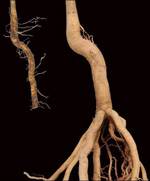 La raíz del tap se poda para que los árboles se puedan mover fácilmente a otros campos a medida que los árboles crecen (foto izquierda, Dr. Gary Watson). Después de la poda de la raíz (lado izquierdo de la foto), las nuevas raíces generalmente crecen en ángulo desde justo detrás de la superficie cortada de la raíz cortada podada formando una llamarada adventicia un año después (lado derecho de la foto). Una mirada cercana a la foto de los dos árboles muestra que ninguna de las pequeñas raíces laterales presentes detrás de la raíz de la poda se convirtió en raíces permanentes. La porción de 4-7 pulgadas de largo del árbol sobre el brote de raíz adventicio es tejido de raíz (llamado vástago de raíz), no tejido de tronco. Puede parecer que el cultivador plantó el árbol demasiado profundamente. Algunos árboles, especialmente las especies ribereñas como el sicómoro, pueden desarrollar raíces laterales a partir del vástago de la raíz.raíces