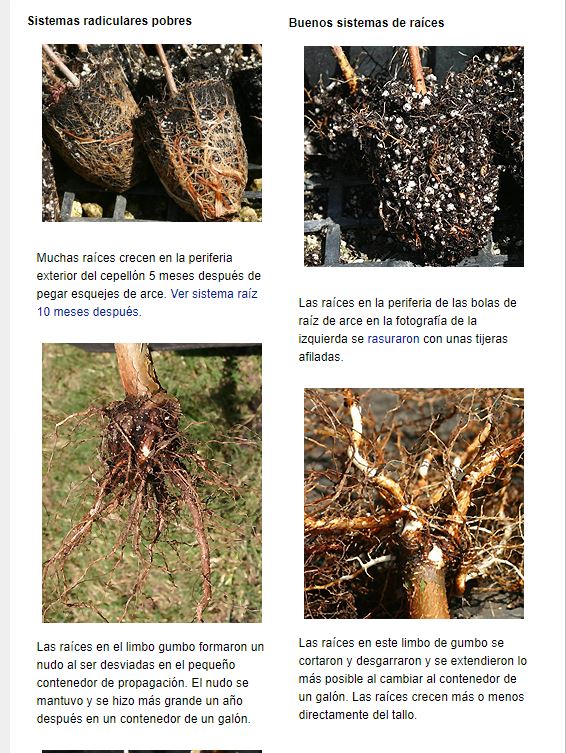 Los contenedores se fabrican en una variedad de formas y tamaños y están construidos con muchos materiales diferentes. . Estos incluyen plástico, papel, aluminio, contenedores para el cultivo de árboles telas, madera y turba. Las raíces son desviadas por la pared del contenedor hacia abajo y alrededor del borde del contenedor. Esto puede convertirse en defectos de raíz graves si los árboles se dejan en el contenedor durante demasiado tiempo. Los recipientes especialmente diseñados reducen pero no eliminan la cantidad de raíces circulares (algunas se muestran a la derecha). Los árboles crecen aproximadamente al mismo ritmo en los distintos contenedores. Los árboles que crecen en contenedores deben ser podados de raíz para eliminar las raíces circulares y descendentes cada vez que el árbol esté en maceta a un tamaño más grande Esto da como resultado un sistema de raíces con raíces rectas distribuidas radialmente alrededor del tronco. Si no se elimina cada vez que el árbol está en maceta a un tamaño más grande, podrían desarrollarse defectos de raíz severos que hacen que el árbol sea sacrificado