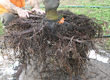 los árboles jóvenes pueden tener sus raíces extendidas La poda mecánica de la raíz también se puede usar en la mayoría de las especies de árboles y arbustos para eliminar la mayoría de los defectos de la raíz. La poda que parece eliminar la mayoría de los defectos se despega o afeita toda la superficie exterior del cepellón, incluida la parte inferior (foto derecha). Si las raíces son suaves y jóvenes, se pueden arrancar o arrancar del borde del cepellón y extenderlas al sustrato del contenedor más grande o al suelo (foto de la izquierda). Esto lleva mucho tiempo y los resultados pueden ser variables. Ver: para árboles más grandes.