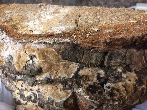 El daño del tronco a las palmeras datileras ( Phoenix dactylifera ) se produce de una manera diferente. Una vez más, los hongos secundarios invaden el tejido dañado del tronco, pero el hongo que causa la descomposición a menudo se observa en el exterior del tronco (Figura 11). Estos hongos no son patógenos (hongos que infectan el tejido sano del tronco), sino saprófitos (hongos que usan tejido dañado como fuente de alimento). Uno de estos hongos ha sido identificado como Ceriporia sp., Un hongo de corteza blanca que destruye la lignina dentro del tronco. La lignina es el compuesto que proporciona la mayor parte de la resistencia estructural en los troncos de palmera. Por lo tanto, si la lignina se destruye (incluso en una palmera muerta o moribunda), el tronco de la palmera pierde su integridad estructural y colapsa.