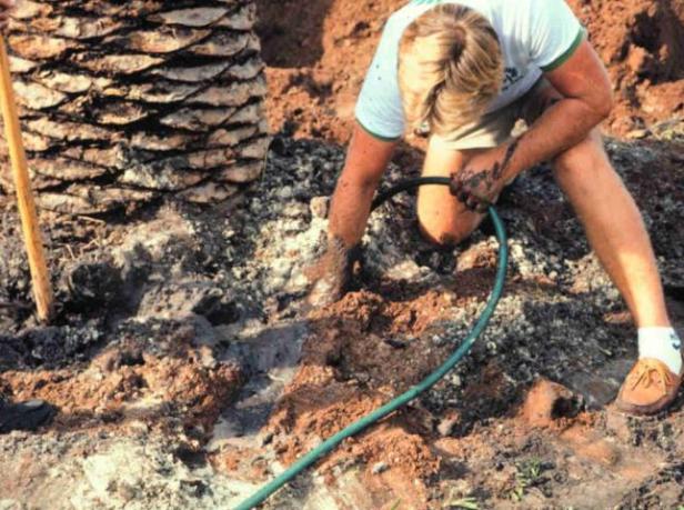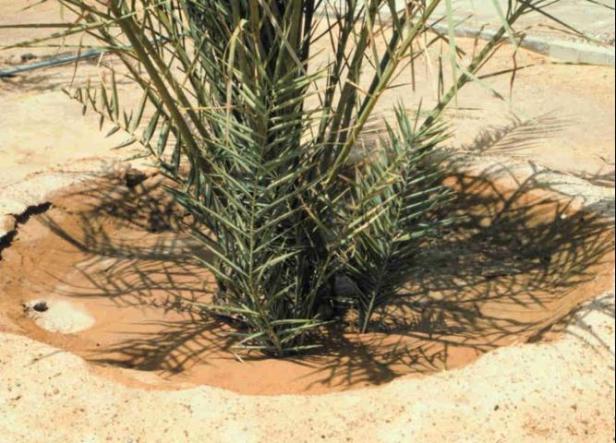 Cuando rellene los agujeros de plantación de palmera, asegúrese de lavar la tierra en todos los huecos para eliminar las bolsas de aire (Figura 10). Se debe construir una berma poco profunda alrededor del perímetro del cepellón de la palma recién transplantada para retener el agua en el área del cepellón durante el riego (Figura 11). El suelo alrededor del cepellón debe mantenerse uniformemente húmedo, pero nunca saturado durante los primeros cuatro a seis meses después del trasplante. Después de ese tiempo, la frecuencia de riego puede reducirse o eliminarse por completo si se recibe la lluvia adecuada. La investigación no ha demostrado ningún beneficio al regar la corona de la palmera frente a la aplicación de agua al suelo (Broschat 1994).