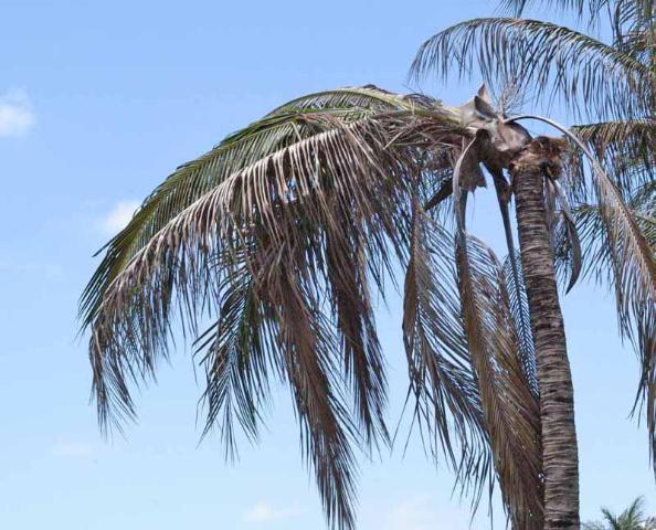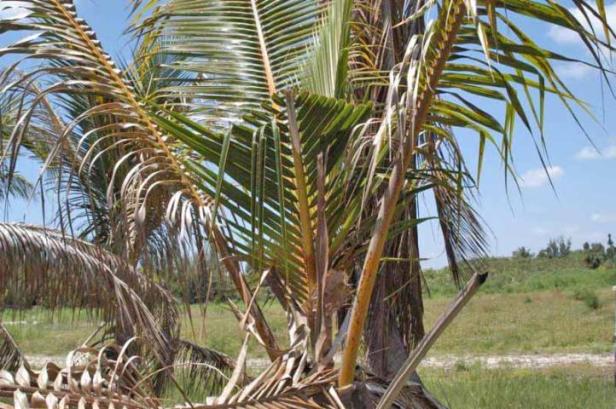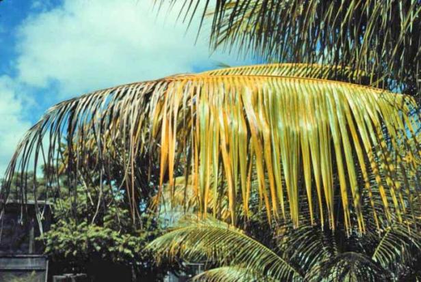Colapso del dosel de la palma en la palma de coco (C. nucifera) debido a la pudrición secundaria del tejido del tronco dañado por el frío aproximadamente tres meses después de temperaturas de enfriamiento prolongadas.