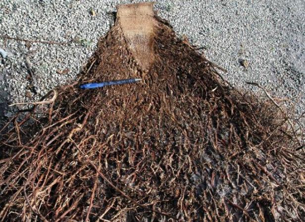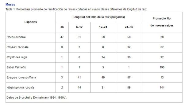 Sin embargo, para la mayoría de las otras especies de palmeras, la supervivencia de la raíz se correlacionó fuertemente con la distancia desde el tronco que se cortó la raíz; Las raíces cortadas a 3 pies del tronco sobrevivieron mucho mejor que las raíces cortadas a 6 pulgadas del tronco.