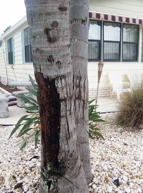En la palmera navideña ( Adonidia merrillii ) y la palmera reina ( Syagrus romanzoffiana ), se produce una lenta descomposición del tronco. A veces, la descomposición del tronco es aparente desde el exterior como un agrietamiento de la pseudocorteza, pero a menudo ocurre debajo de la pseudocorteza y no se hace evidente hasta que la pseudocorteza y grandes porciones del tronco se han descompuesto y caído (Figura 10). En otros casos, el dosel se marchita y colapsa (debido a la destrucción del tejido vascular) o el colapso del tronco (falta de integridad estructural). En cualquier caso, las palmeras suelen vivir durante al menos dos años, y a menudo más tiempo, antes de que el problema se vuelva aparente, y nunca se observa crecimiento de hongos.